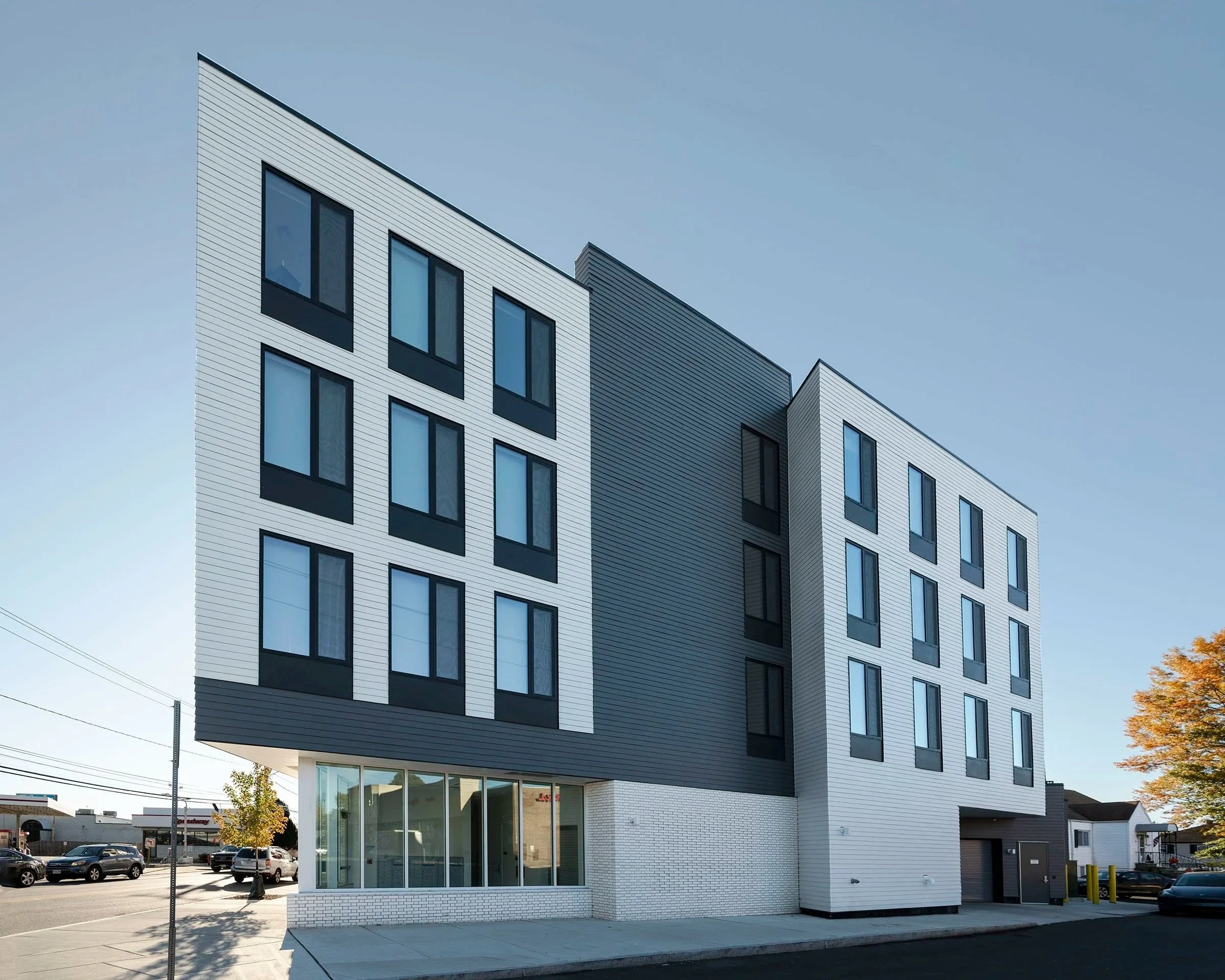 • Modern brick multifamily housing with transparent ground-floor entry and street activity.